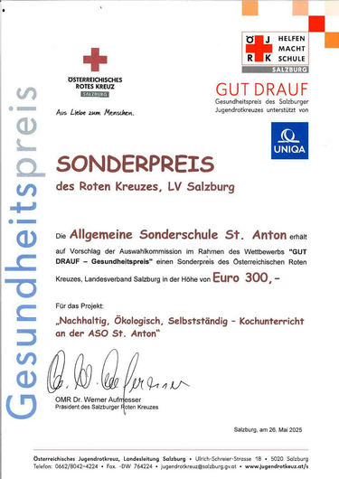 Im Jahr 2013 erhielt die ASO St. Anton den Sonderpreis zum Österreichischen Schulpreis. Das Bundesministerium für Bildung und Frauen (BMBF) verleiht jährlich den „Österreichischen Schulpreis“. Er zeichnet hervorragende und innovative Schulen aus und will damit einen wichtigen Impuls für die Weiterentwicklung von Schule und Unterricht in Österreich geben.